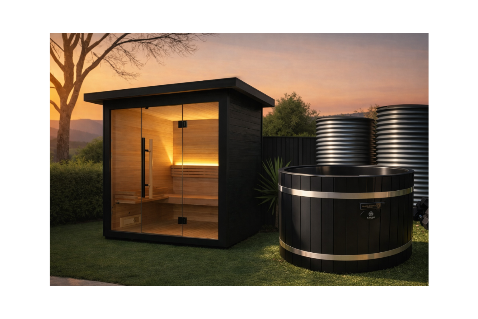 The Solmora Contrast Therapy Bundle unites the Black Outdoor Traditional Sauna and the Black Cold Plunge Pool (Olive Ice Tub) into one complete hot-and-cold wellness sanctuary.